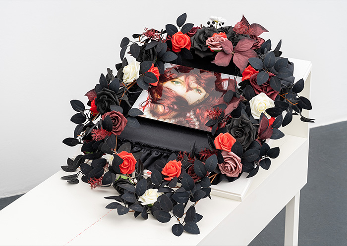 The exhibition “Im Visier” ("In Sight") brings together works (from 2004 to 2025) that are characterized by a remarkable diversity and combine themes such as suffering or deprivation of liberty with strongly “camp”-like materials. Scenes from crime scenes (such as “Autumn”, 2025), laying-out room or mourning room (such as “Wedding Night”, 2025), self-defence equipment or camouflaged weapons (such as “Messer Rucksack: Le Voyage”, 2025 or “Fuck off”, 2004)... Renate Bertlmann exhibits objects arranged in display cases, as in ethnological museums, and makes use of visual worlds that are considered kitsch and obscene. This exaggerated visual language represents a powerful vector of irony for the artist - it irritates, destabilizes and at the same time opens a door to the absurd and grotesque; an artistic strategy of uncertainty that Bertlmann has always pursued. She targets socio-cultural gender hierarchies and questions what is considered “appropriate” or “acceptable”.